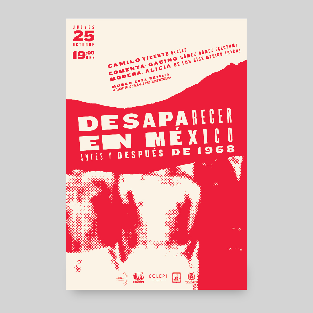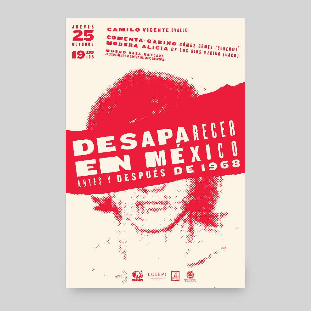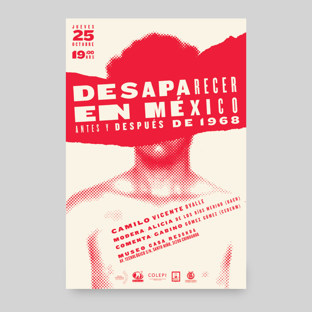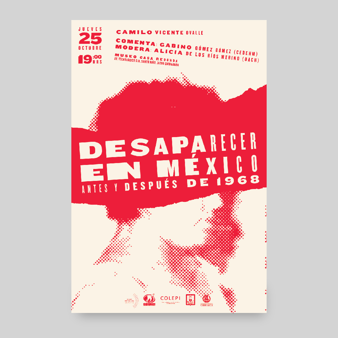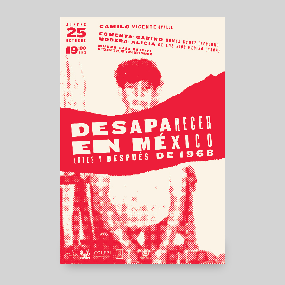 Poster design for the conference of Dr. in History Camilo Vicente Ovalle "Desaparecer en México" (To disappear in Mexico), which dwelves into the enforced disappearence phenomena in Mexico spanning from the post-war years up to the decade of the 70s. The conference took place in the Autonomous University of Chihuahua, México (UACH).
