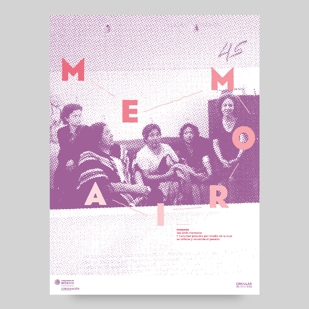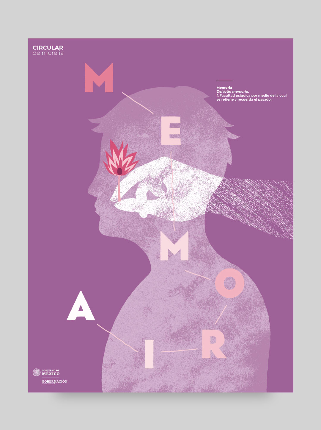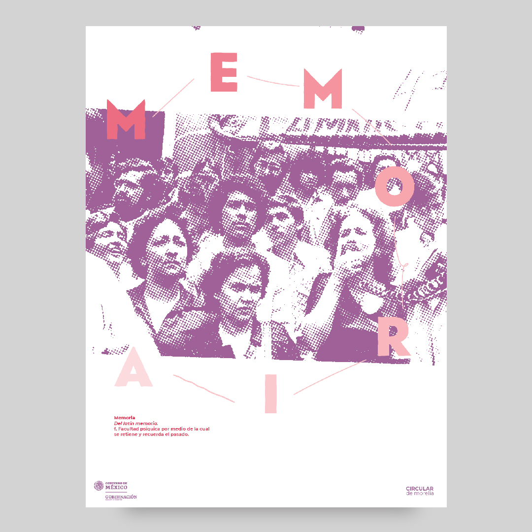 Circular de Morelia No. 8 funcionó como sitio de operaciones y centro clandestino de detención de la Dirección Federal de Seguridad de 1974 a 1985; desde este lugar se registró, interrogó, torturó y administró el envío de personas detenidas-desaparecidas a otros sitios de reclusión, legales o clandestinos. Para el primer aniversario del espacio, ahora como Sitio de Memoria, diseñé una serie de carteles que tienen como eje central el papel de la memoria en la cultura.