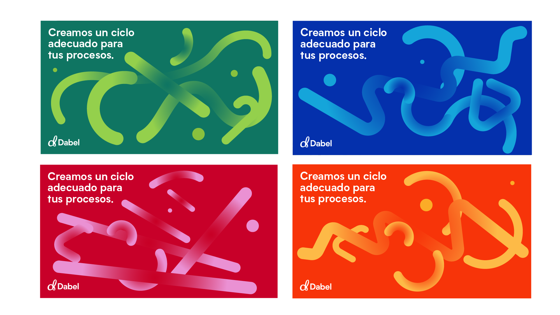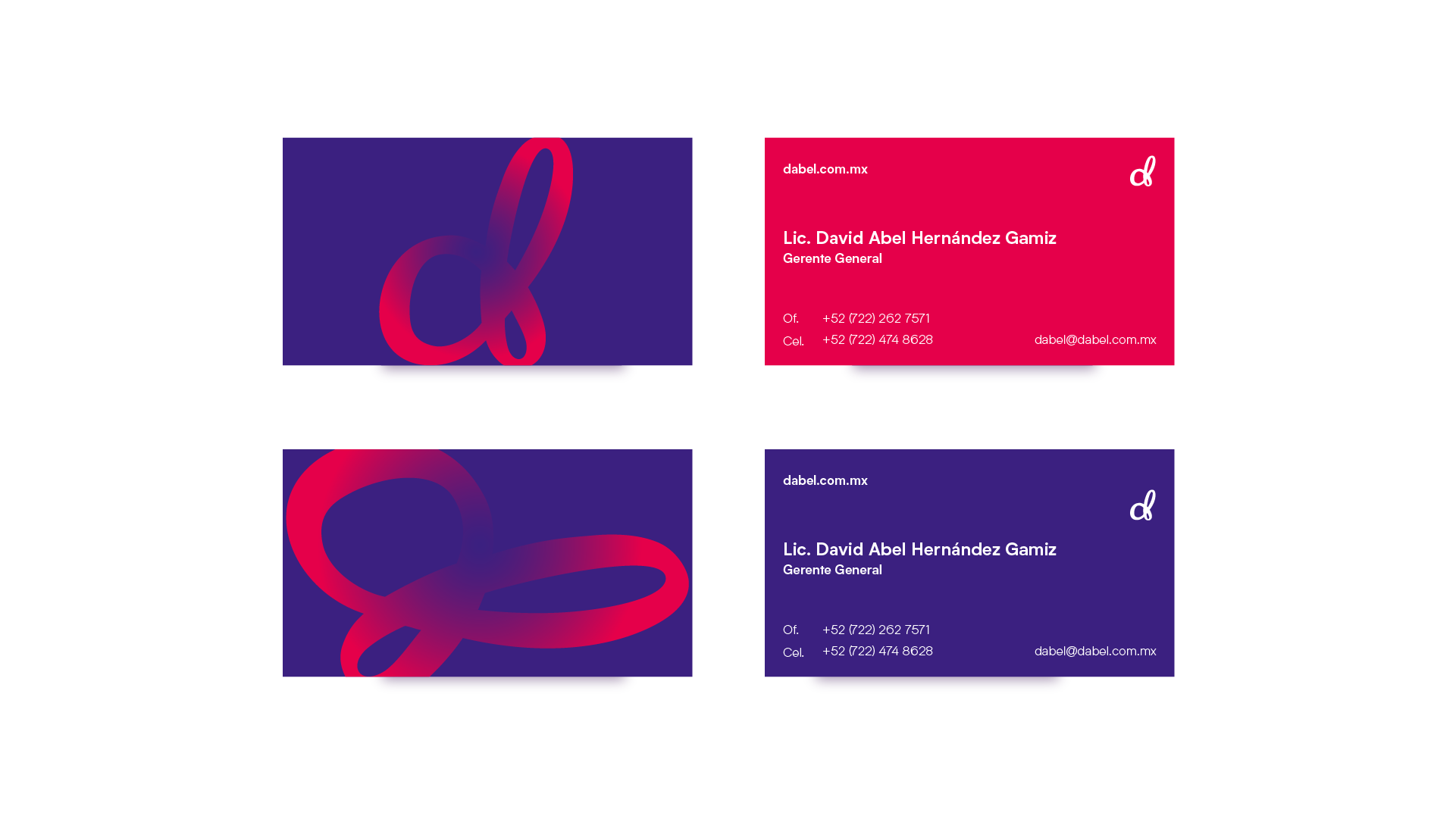 Dabel is a consulting agency dedicated to offer standardization processes and innovation courses to their clients. For the brand, I conceived a fresh and dynamic corporative image. The "D" from Dabel is portrayed at the same time as a Moebius Band, implying the constant synergy between the firm and their clients with the purpose of improving its services.
