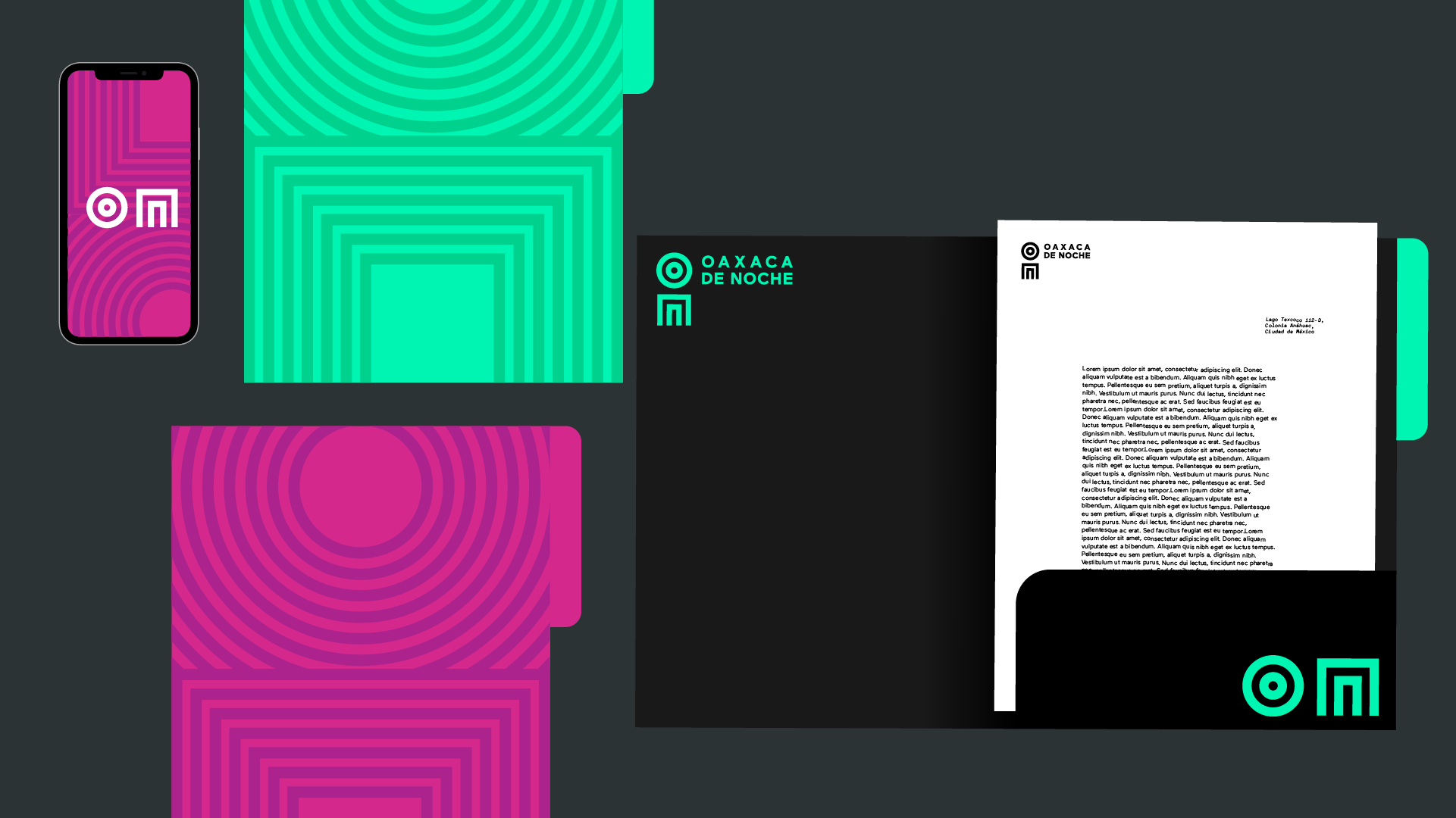 Oaxaca de Noche was a series of videomapping projections along the most important public squares in Oaxaca's downtown. For the visual identity, Cocolab needed an image that would allude to new media but also maintining some aknowledgement to the Oaxacan culture. The green colour was chosen in concordance to the "Cantera verde", a special material that is widely used on the historical buildings of the downtown. Along with that, the two initials of the name were transformed into a sort of abstraction of the Chimalli, a decorative piece present in almost every prehispanic culture decoration. At the same time, some graphic applications were conceived to resemble Oaxacan textiles.