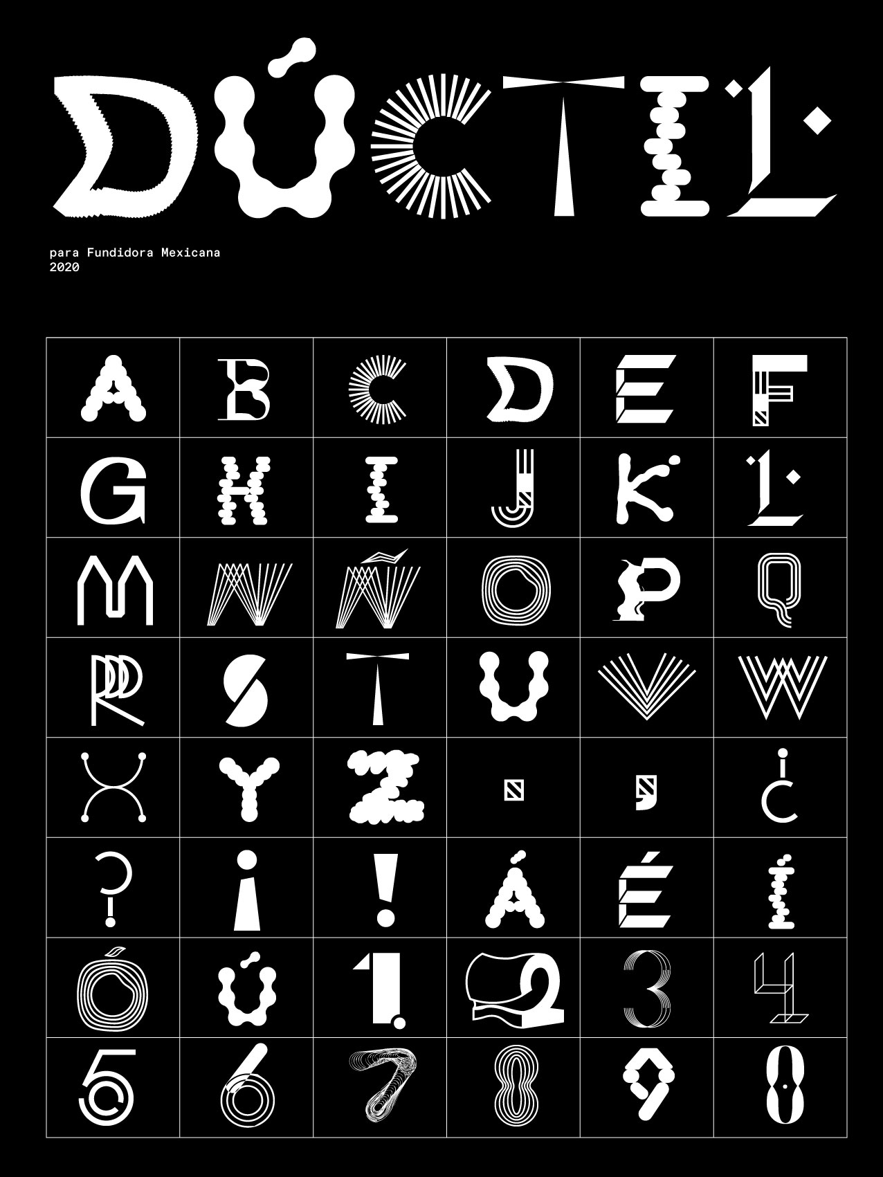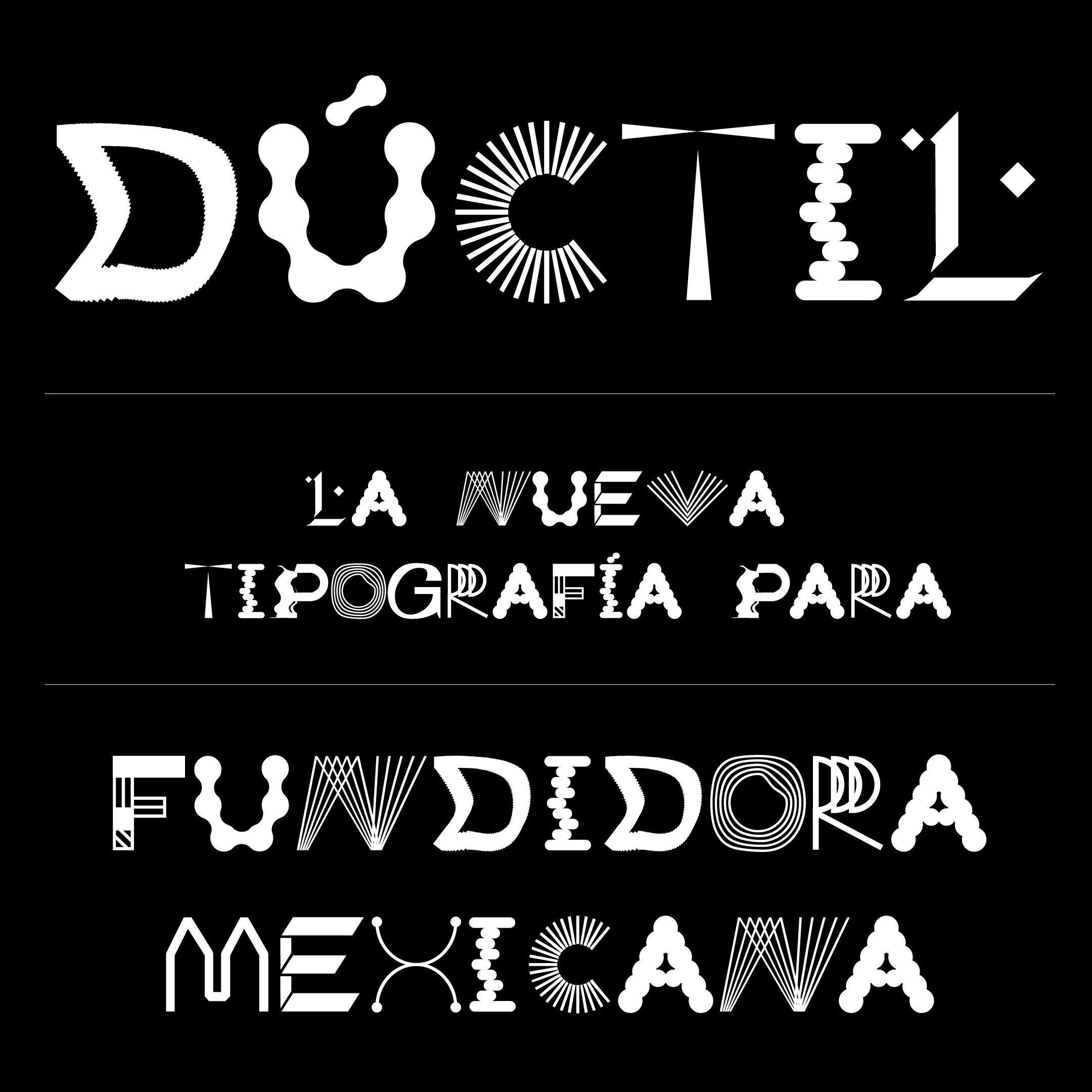 Dúctil es una propuesta tipográfica que nace a partir de la observación de letreros rotulados a lo largo de la Ciudad de México, particularmente en la zona Centro, donde la cohesión entre una forma y otra realmente no existe y la lógica es más bien un sinsentido de formas y configuraciones distintas. La tipografía forma parte del acervo tipográfico de Fundidora Mexicana, un proyecto de tipografías de distribución libre que replantea el terreno de la tipografía a través de su identidad con el medio.